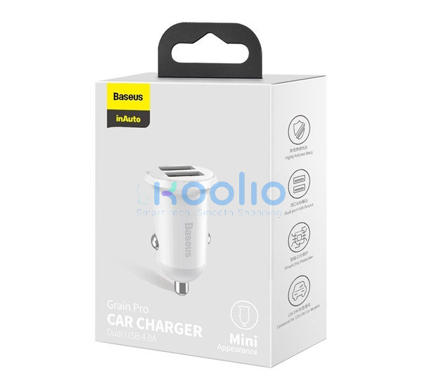 Baseus Grain Pro – Gyors és megbízható autós töltés A Baseus Grain Pro autós töltő két USB porttal rendelkezik, amelyek összesen 4.8A kimeneti teljesítményt biztosítanak, lehetővé téve két eszköz egyidejű gyors töltését. A töltő intelligens iQ chippel van felszerelve, amely automatikusan felismeri a csatlakoztatott eszköz töltési igényeit, és megfelelően állítja be az áramot, így elkerülve a túltöltést és a túlmelegedést. Kompakt és diszkrét kialakításának köszönhetően könnyen illeszkedik a legtöbb autós töltő aljzatba. Teljesítmény: Összesen 4.8A kimeneti teljesítmény két USB porton keresztül, amely gyors és hatékony töltést biztosít. Töltési technológia: Az intelligens iQ chip automatikusan beállítja a szükséges áramot, biztosítva a biztonságos és hatékony töltést. Biztonság: Beépített védelem a túltöltés, túlmelegedés és rövidzárlat ellen. Kompakt méret: Kicsi és könnyű kialakítás, amely diszkréten illeszkedik az autó belső terébe. Kompatibilitás: Kompatibilis a 12V - 24V feszültségtartományú járművekkel, beleértve a személygépkocsikat és teherautókat is.