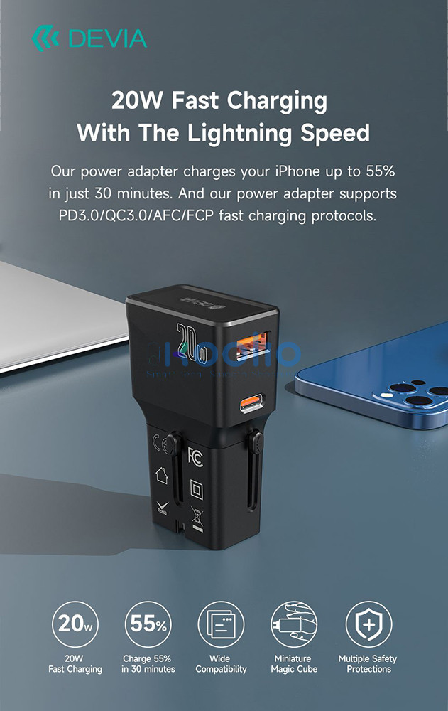 - Széles körű kompatibilitás - a hálózati adapter támogatja a PD3.0 / QC3.0 / AFC / FCP gyorstöltési protokollokat.