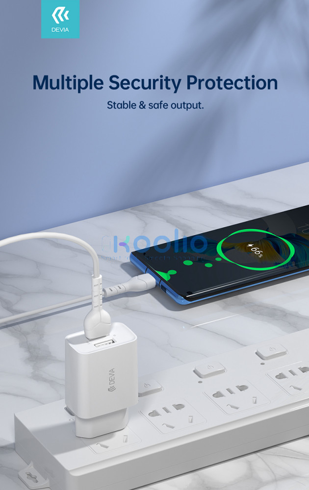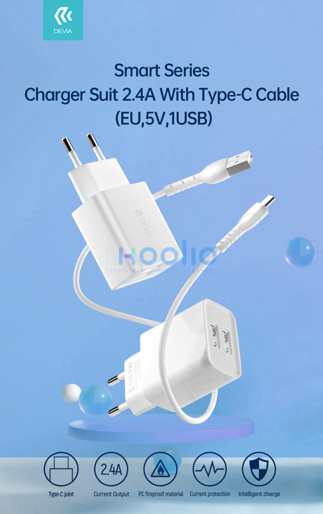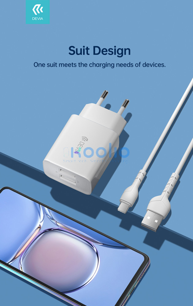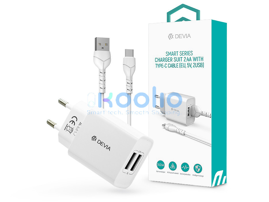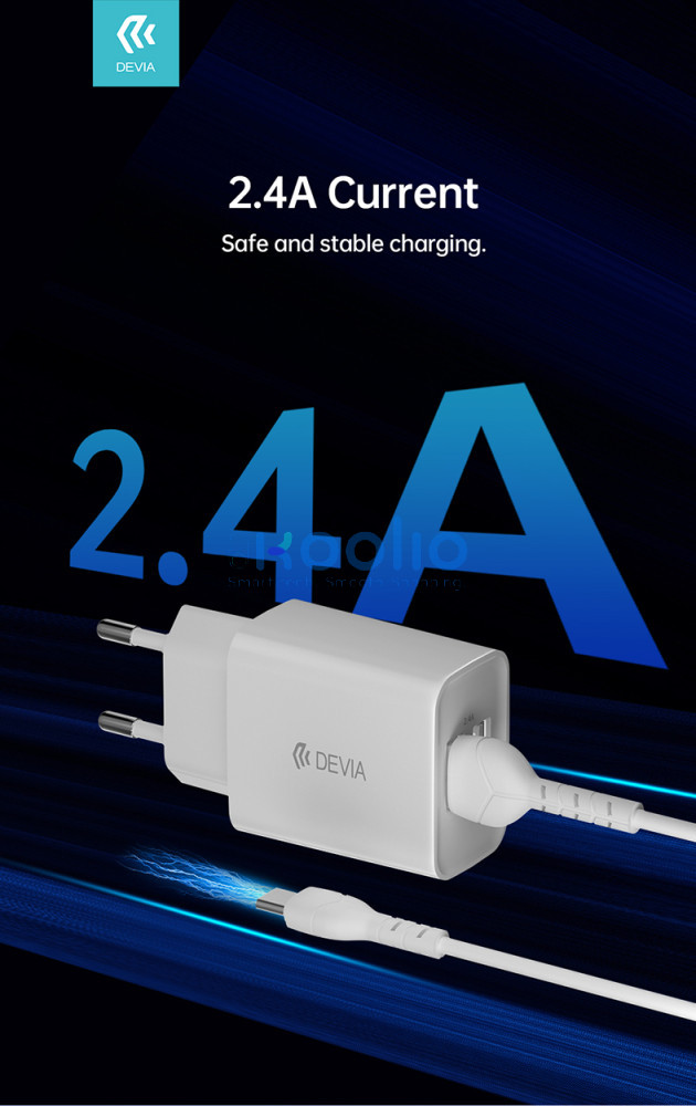 - A Devia Smart egy fejlett fali töltő 2,4 A maximális áramerősséggel, két USB-A porttal felszerelve.