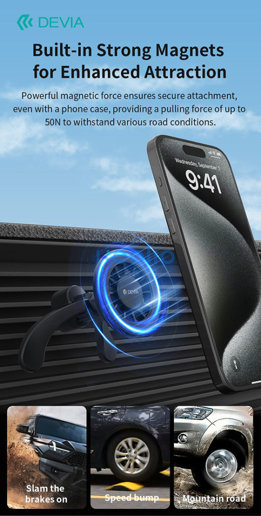 - Az erőteljes mágnes biztosítja a biztonságos rögzítést, még telefontokkal együtt is, akár húzóerőt biztosítva '50N-ig, hogy ellenálljon a különböző útviszonyoknak.