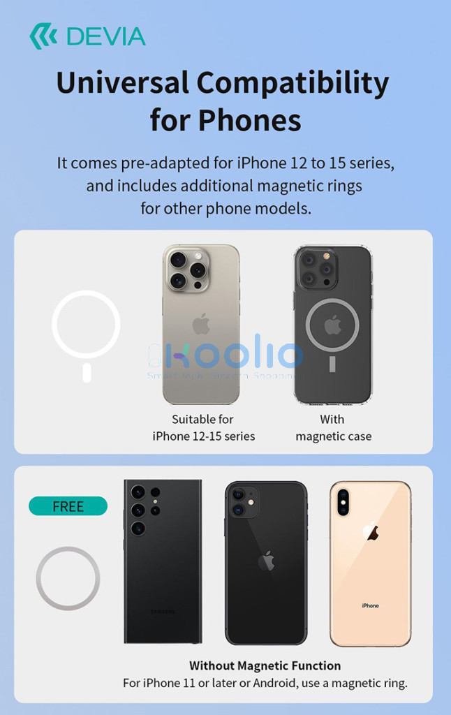 - Kompatibilis a 12-15 sorozatú iPhone-okkal, további mágneses gyűrűkkel más telefonmodellekhez.