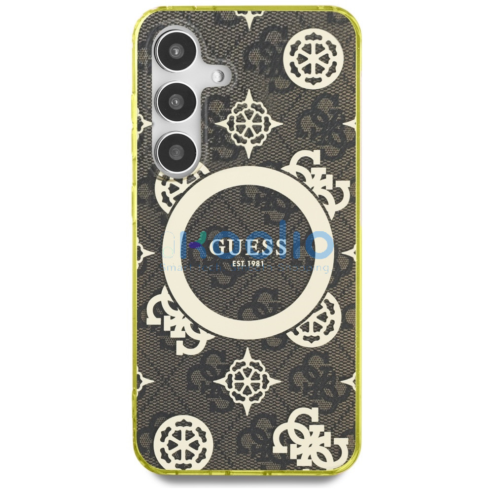 Guess 4G Background Gold Electroplated Peony Pattern Samsung Galaxy S25 MagSafe kemény hátlap tok, barna