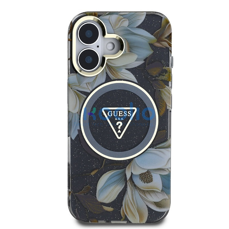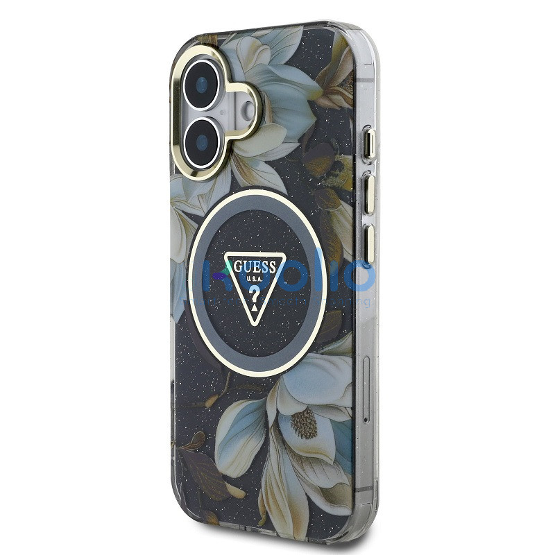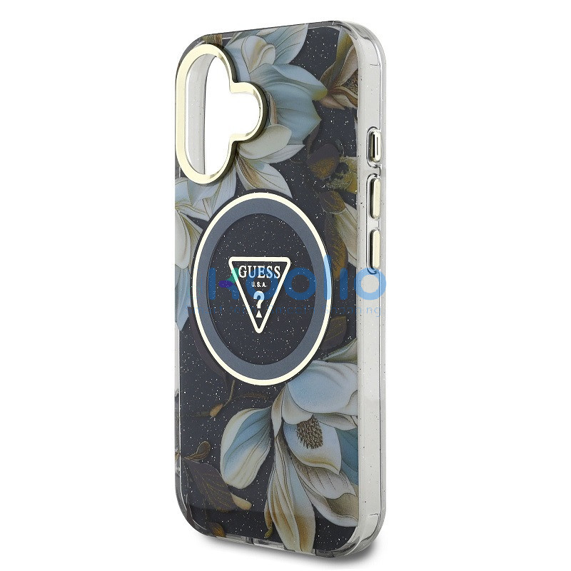 A csillogó alap nem csak kontrasztot ad, hanem kiemeli a magnólia virágok pasztell színeit és elegáns, minimalista megjelenést kölcsönöz a toknak.