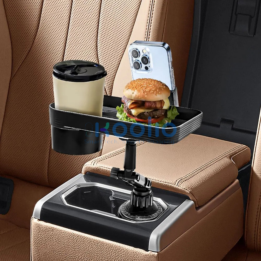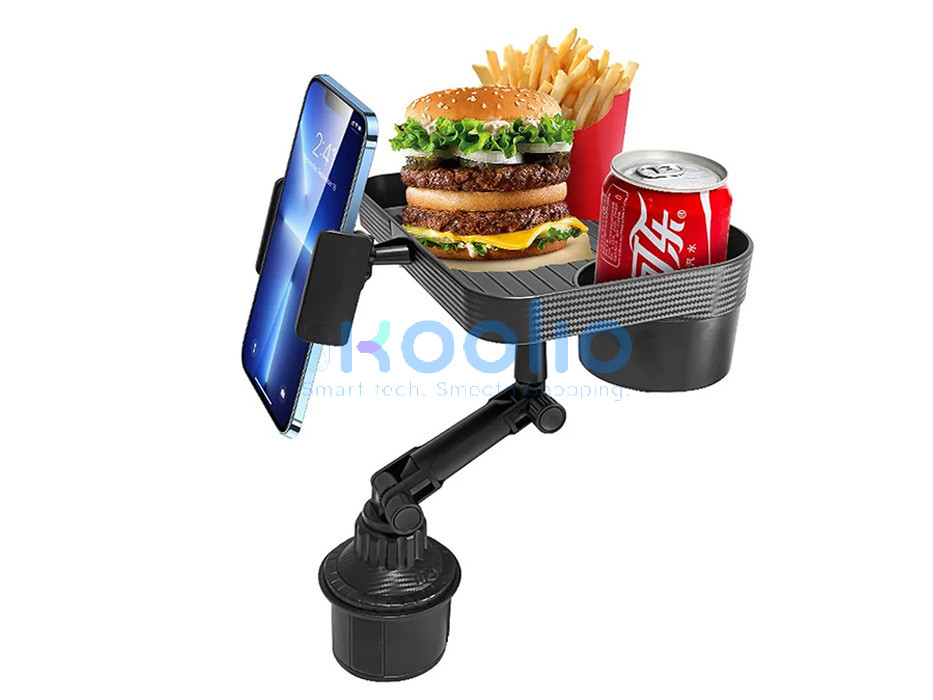 - A telefontartóval ellátott asztali tálca egy praktikus kiegészítő, amely az autó pohártartójába illeszthető, hogy biztonságosan fogyasszon italokat és használja telefonját vezetés közben. Különösen nélkülözhetetlen üzleti utakon!