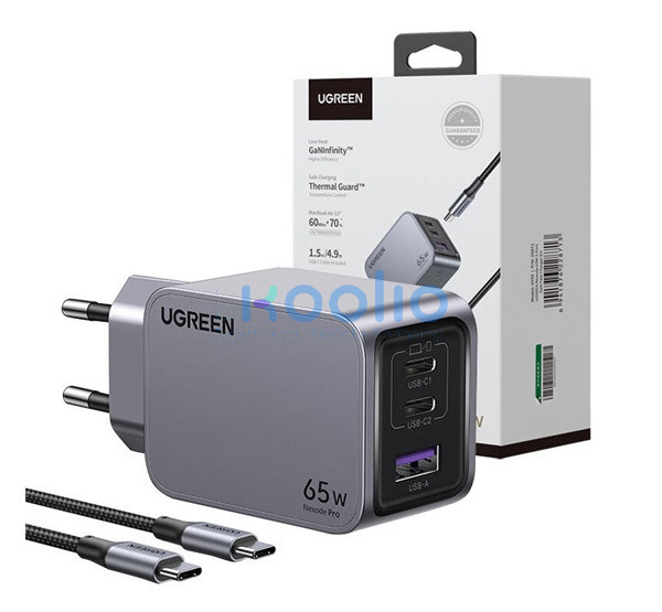 Ugreen Nexode Pro USB-A + 2x USB-C hálózati töltő adapter + USB-C kábel, 65W, 1.5m, fekete