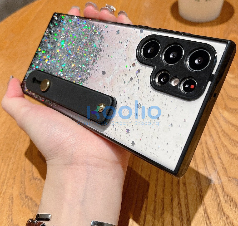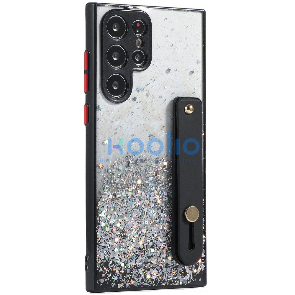 Apple iPhone 15 Pro Max, Szilikon tok, közepesen ütésálló, kézpánttal, színátmenetes, csillogó minta, Wooze Strap Star, mintás/fekete