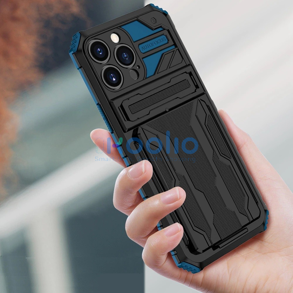 Apple iPhone 15 Plus, Műanyag hátlap védőtok szilikon belső, közepesen ütésálló, kitámasztóval, kártyatartóval, Wooze Transformer, fekete/lila