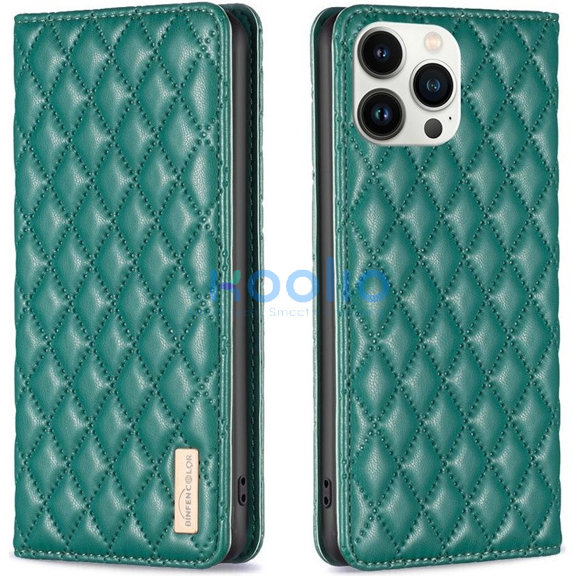 Apple iPhone 15 Plus, Oldalra nyíló tok, stand, kártyatartóval, 3D rombusz minta, Wooze Pillow, zöld