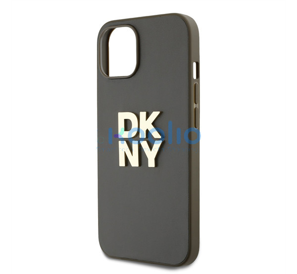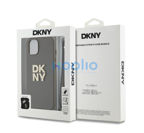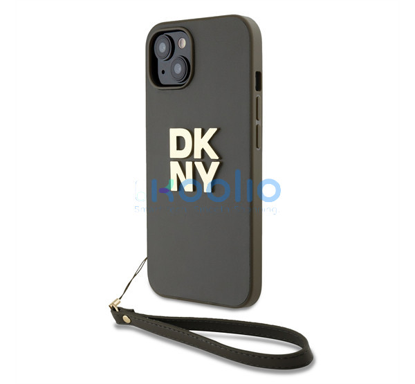 DKNY PU Leather Stack Logo Apple iPhone 15 hátlap tok csuklópánttal, barna