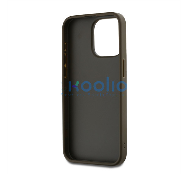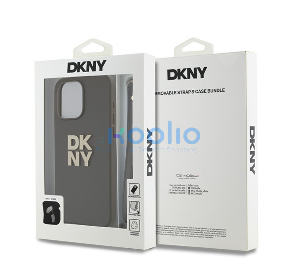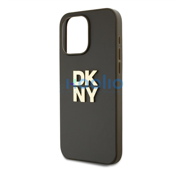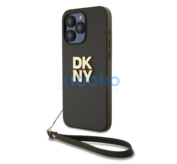 DKNY PU Leather Stack Logo Apple iPhone 15 Pro Max hátlap tok csuklópánttal, barna