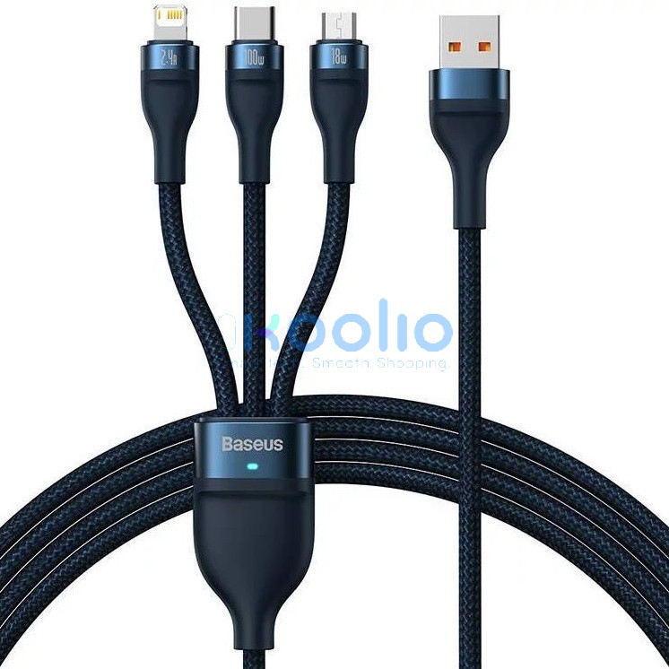 USB töltő- és adatkábel 3in1, USB Type-C, Lightning, microUSB, 120 cm, 3500 mAh, 100 W, törésgátlóval, gyorstöltés, cipőfűző minta, Baseus Flash Series 2, CASS030003, sötétkék