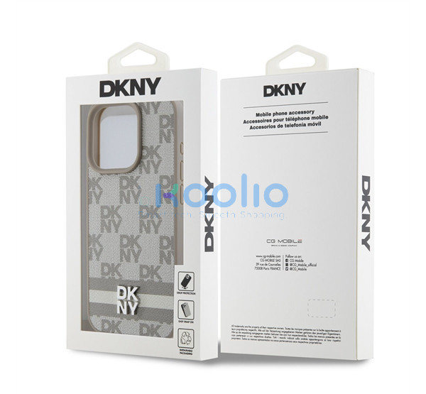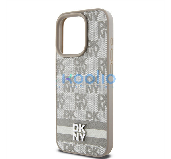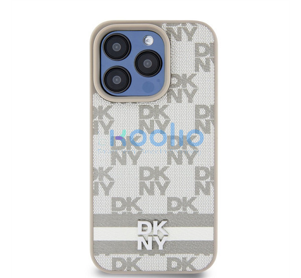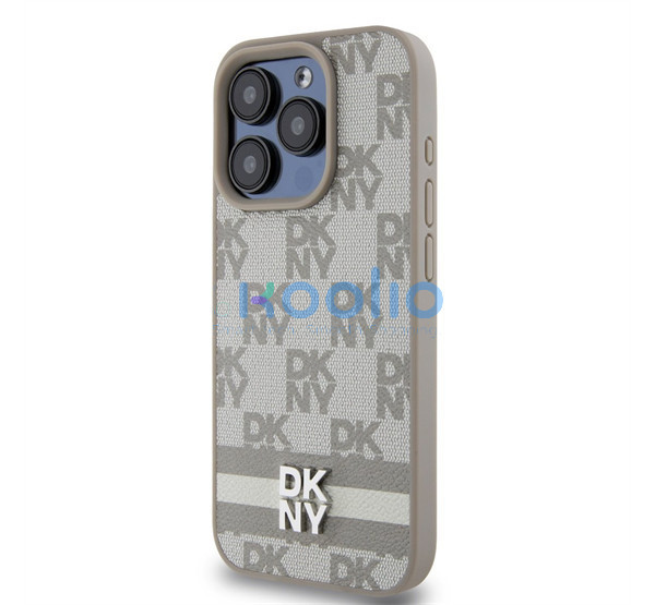 DKNY PU Leather Checkered Pattern and Stripe iPhone 15 Pro Max hátlap tok, bézs