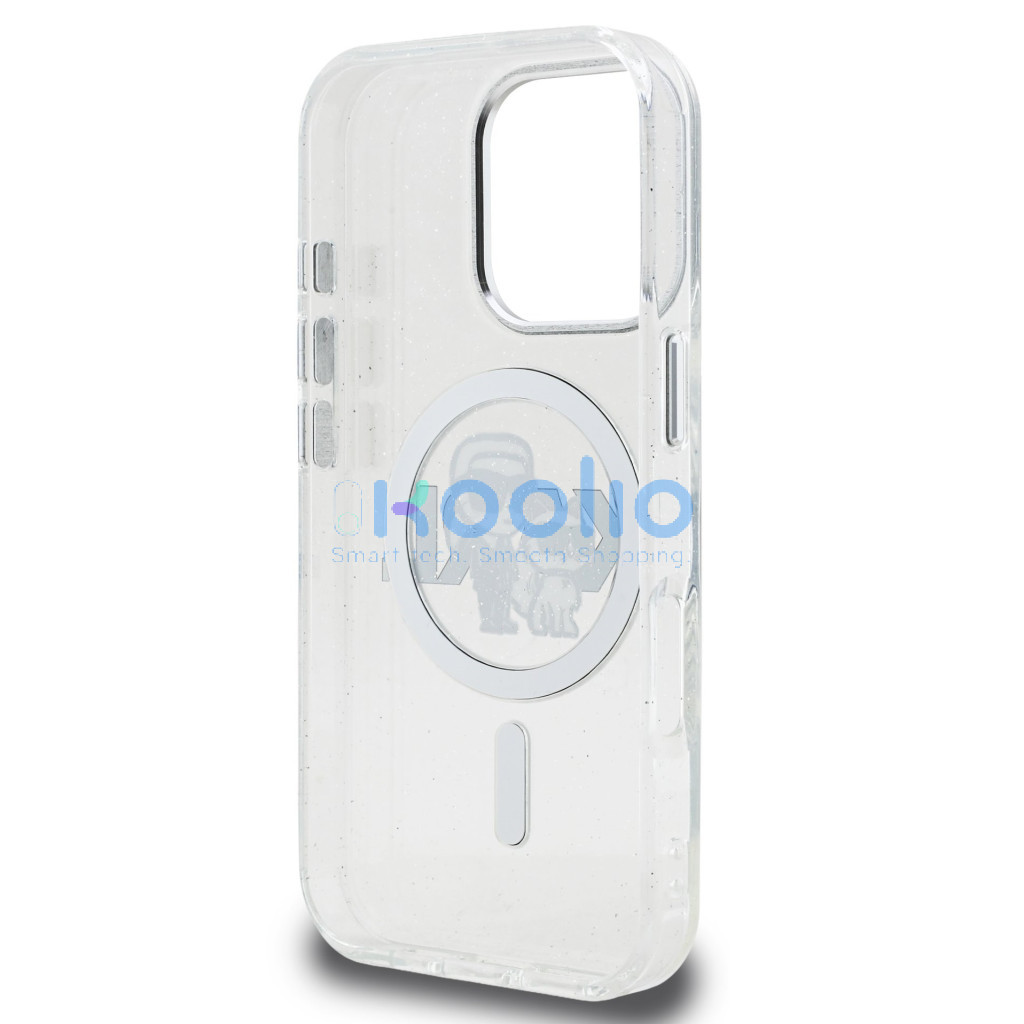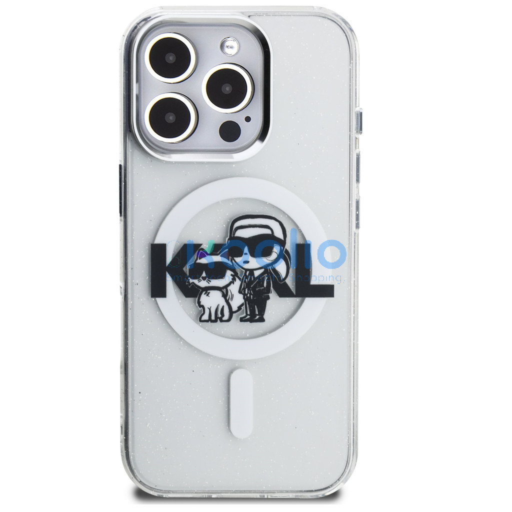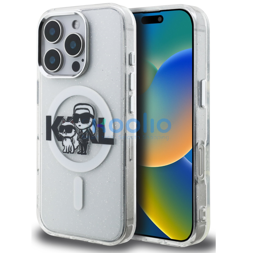 Karl Lagerfeld IML Glitter Karl and Choupette Sketch iPhone 16 Pro MagSafe kompatibilis hátlap tok, átlátszó