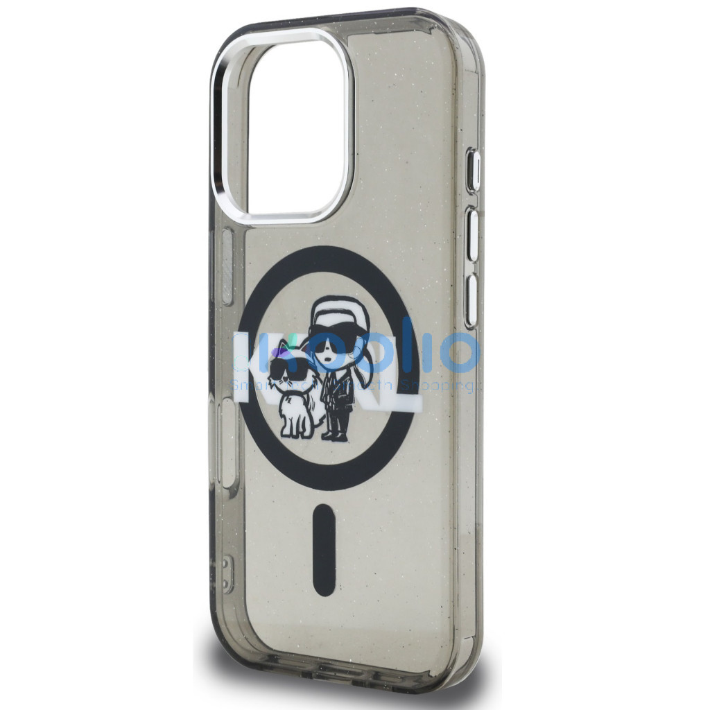 Karl Lagerfeld IML Glitter Karl and Choupette Sketch iPhone 16 Pro MagSafe kompatibilis hátlap tok, fekete
