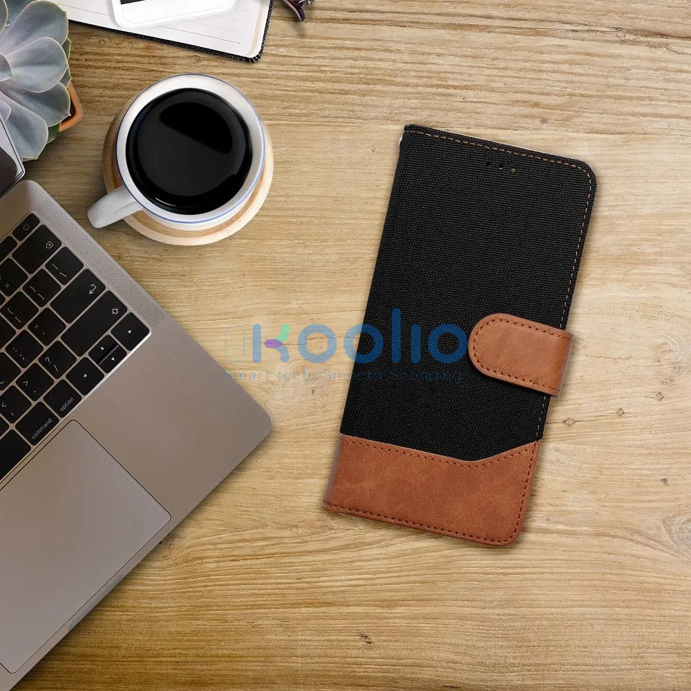 Apple iPhone 16e / 17e, Oldalra nyíló tok, stand, kártyatartóval, farmer minta, Jeans Book, fekete
