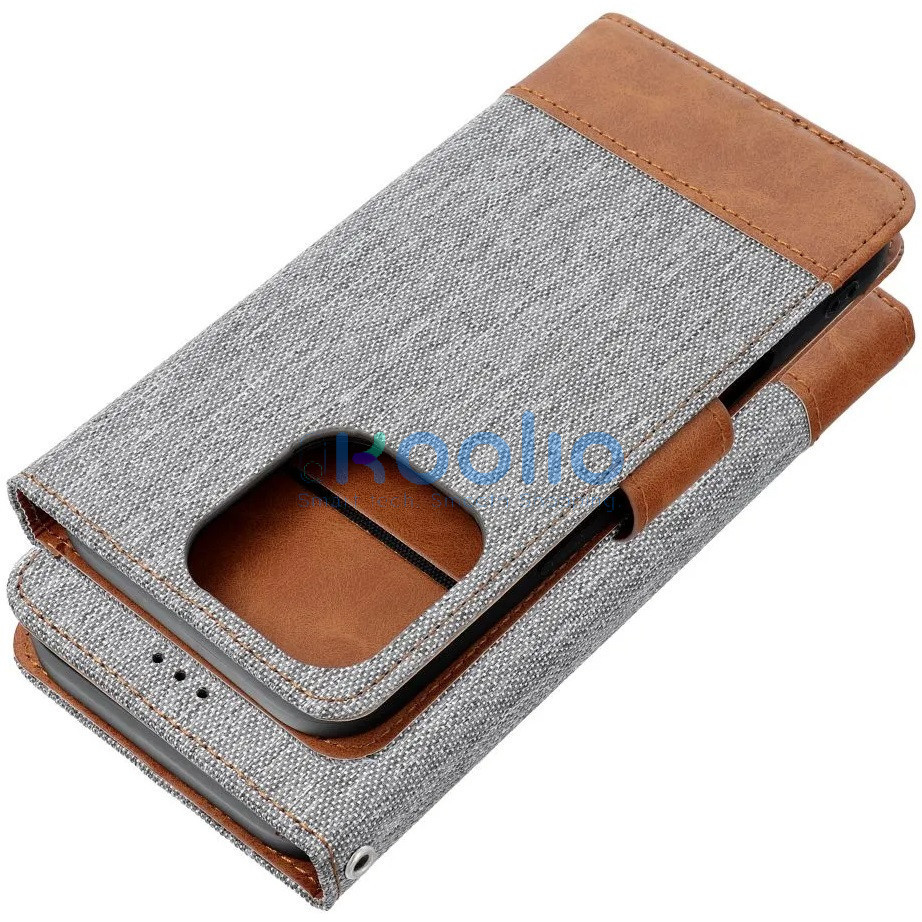 Apple iPhone 17 Pro Max, Oldalra nyíló tok, stand, kártyatartóval, farmer minta, Jeans Book, szürke