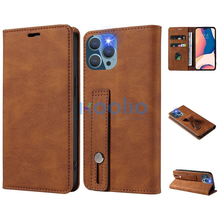 Apple iPhone 16 Plus, Oldalra nyíló tok, stand, kártyatartóval, kézpánttal, Wooze Business Plus, barna