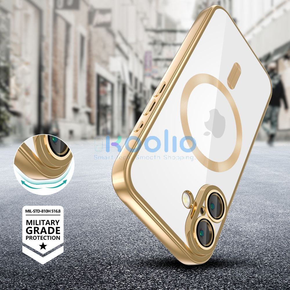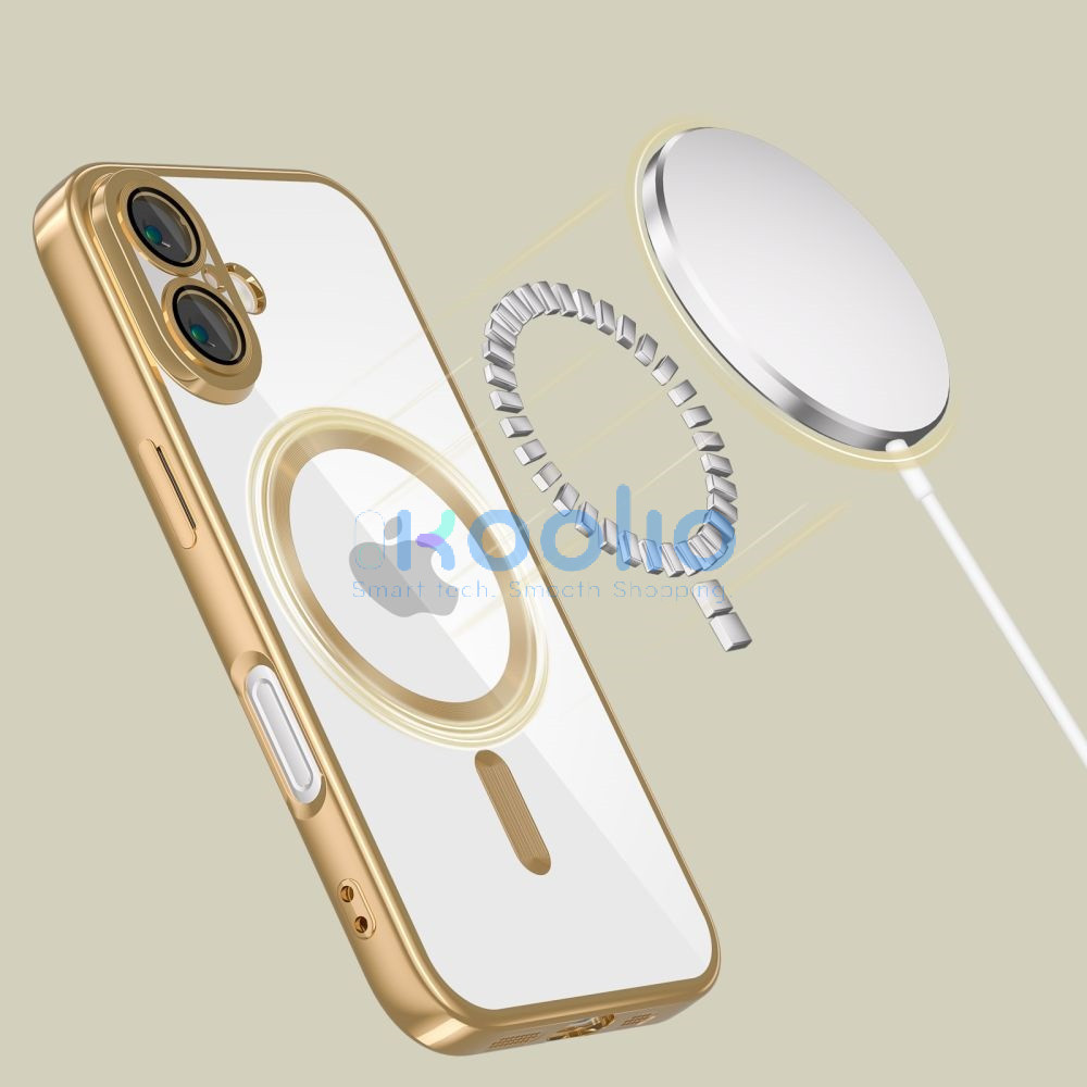 Apple iPhone 16, Műanyag hátlap védőtok + szilikon keret, közepesen ütésálló, Magsafe töltővel kompatibilis, fényes keret, Magflex Magsafe, átlátszó/arany