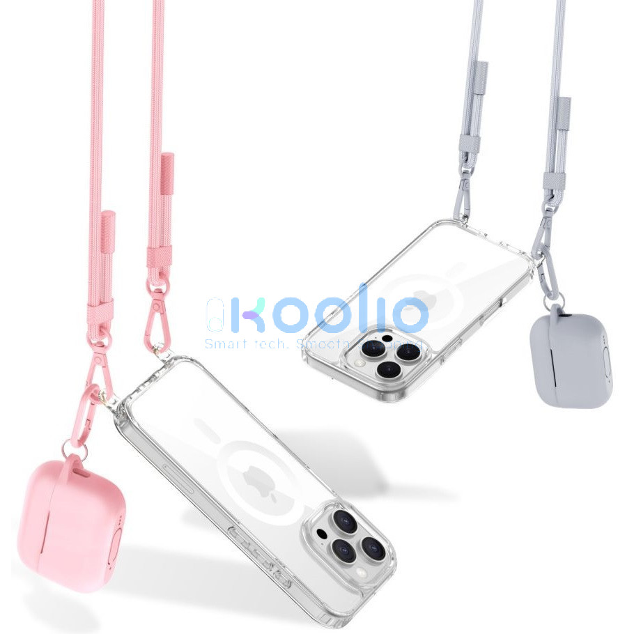 Apple iPhone 16 Pro, Szilikon védőkeret + műanyag hátlap, nyakbaakasztó, Magsafe töltővel kompatibilis, FlexAir Chain Magsafe, átlátszó (szürke, rózsaszín)